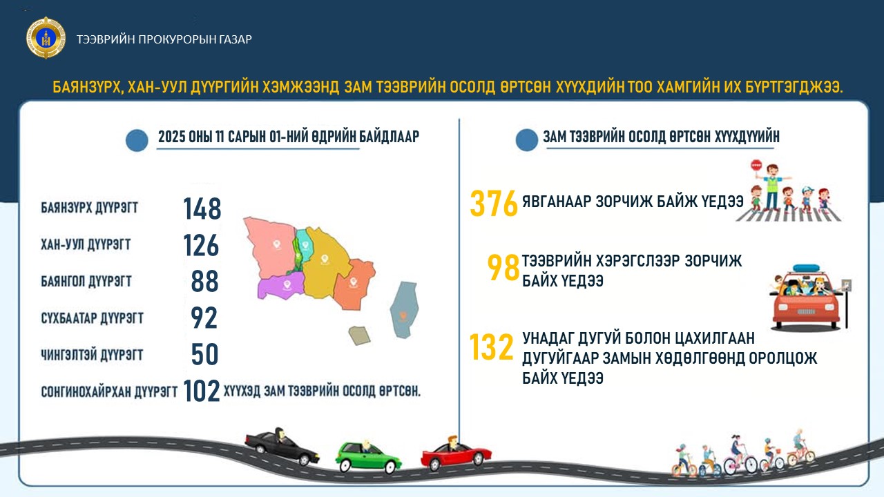 Тээврийн прокурорын газраас Нийслэлийн хэмжээнд 2025 оны 11 дүгээр сарын 01-ний өдрийн байдлаар хүүхэд гэмтсэн зам тээврийн ослыг судлахад 552 зам тээврийн ослын улмаас 606 хүүхэд өртсөн байна. Үүнээс Баянзүрх, Хан-Уул дүүргүүдэд хамгийн их бүртгэгджээ.